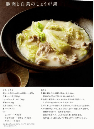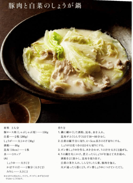 白菜の茎を入れ、しんなりとしたら葉、豚肉を加え、火が通ったら器にとり、ポン酢醤油につけて食べる
